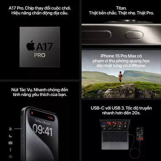 iPhone 15 Pro Max là sản phẩm hàng đầu của Apple hiện tại, được trang bị RAM 6GB, chip A17 Pro tiến trình 3nm hiệu suất cao và tiết kiệm năng lượng, cùng hệ điều hành iOS 17, giúp chiếc điện thoại này có thể xử lý mượt mà các tác vụ nặng như chơi game, chỉnh sửa video, thiết kế đồ họa hay làm việc đa nhiệm.