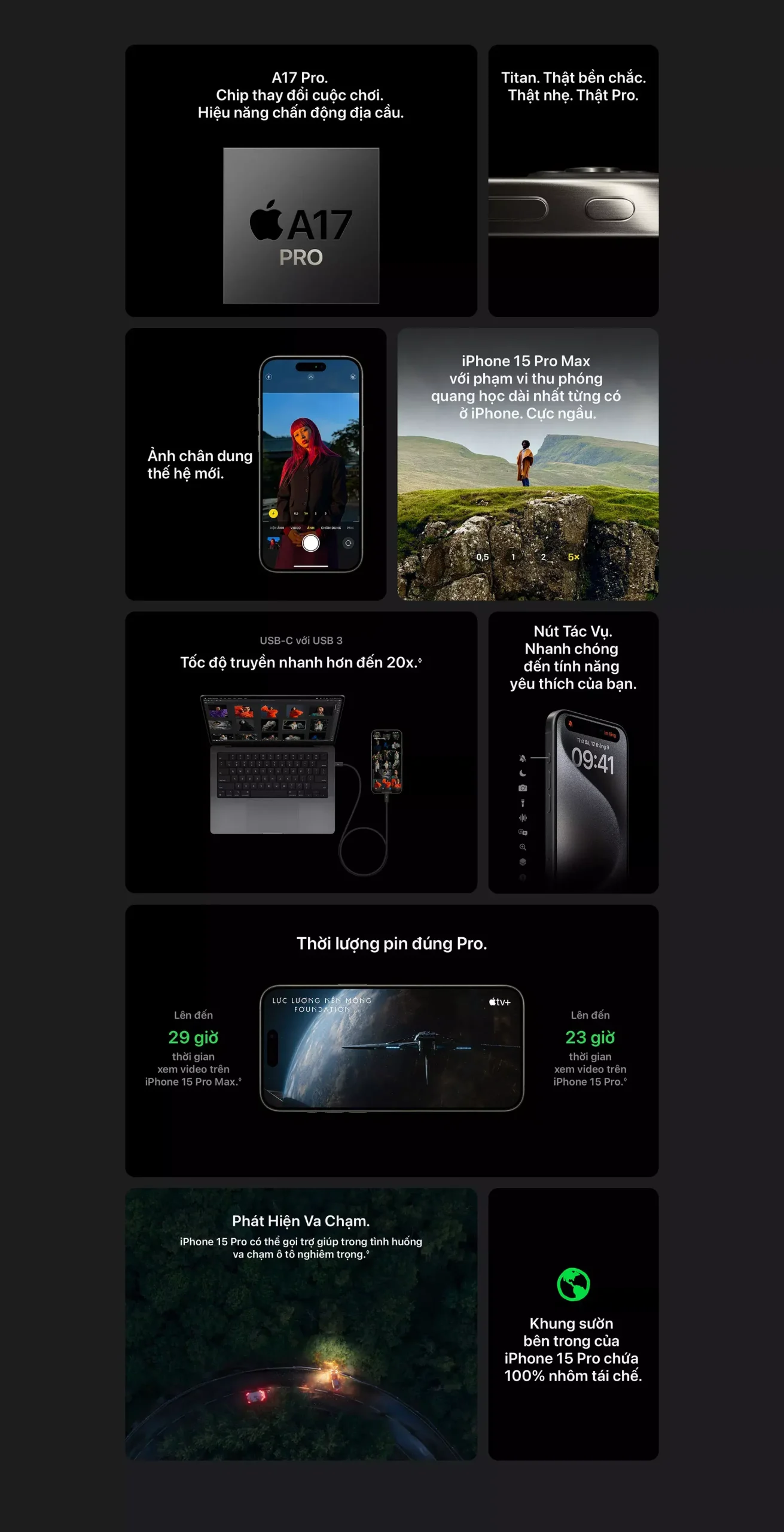 Ngoài ra, Titanium còn có độ bền vượt trội so với kim loại cùng trọng lượng, cũng như có khả năng hấp thụ xung động tốt, giúp bảo vệ màn hình, mặt kính sau và các linh kiện bên trong của iPhone 15 Pro Max khi rơi hay va chạm mạnh, qua đó giúp độ bền của sản phẩm tăng cao hơn nhiều lần so với khung thép không gỉ.